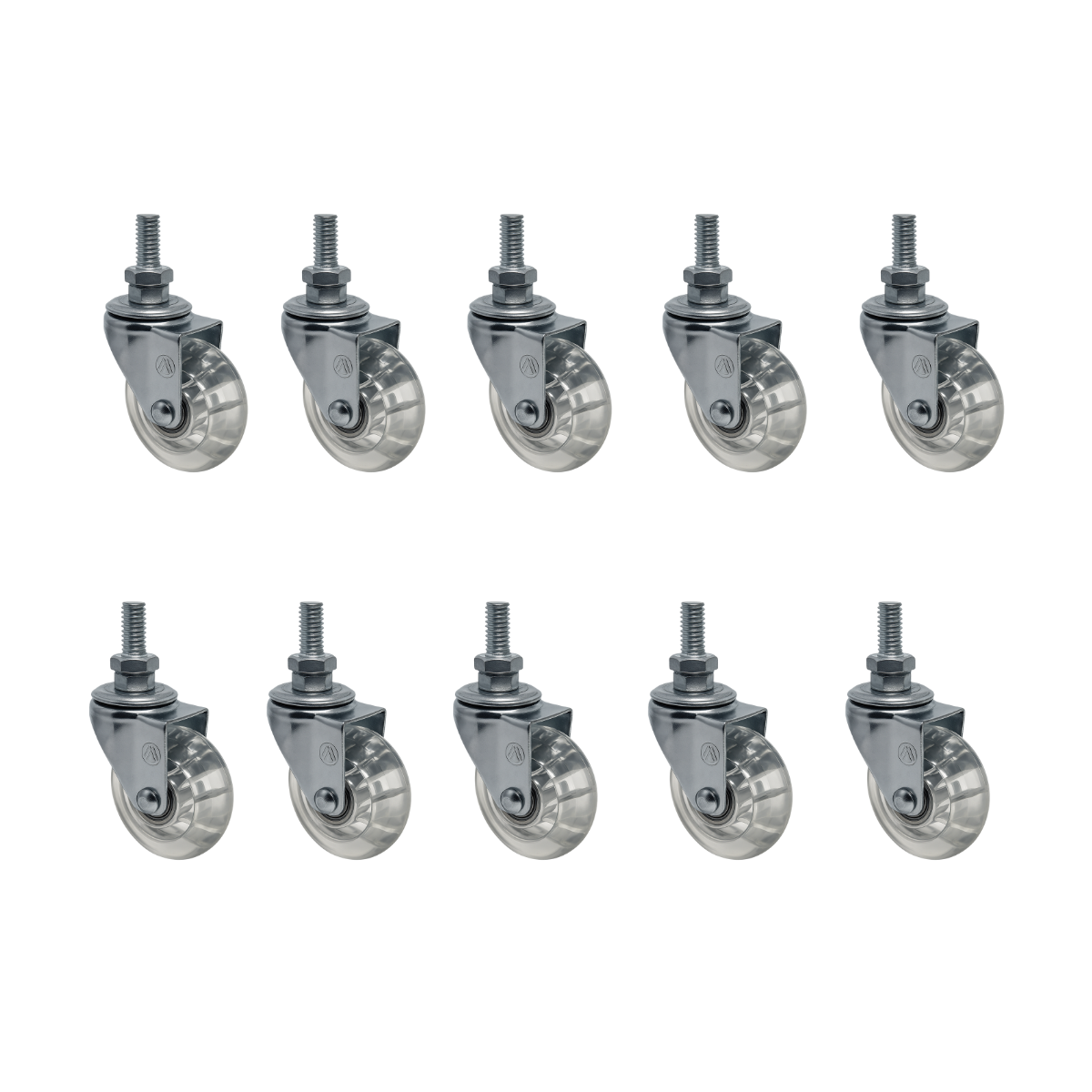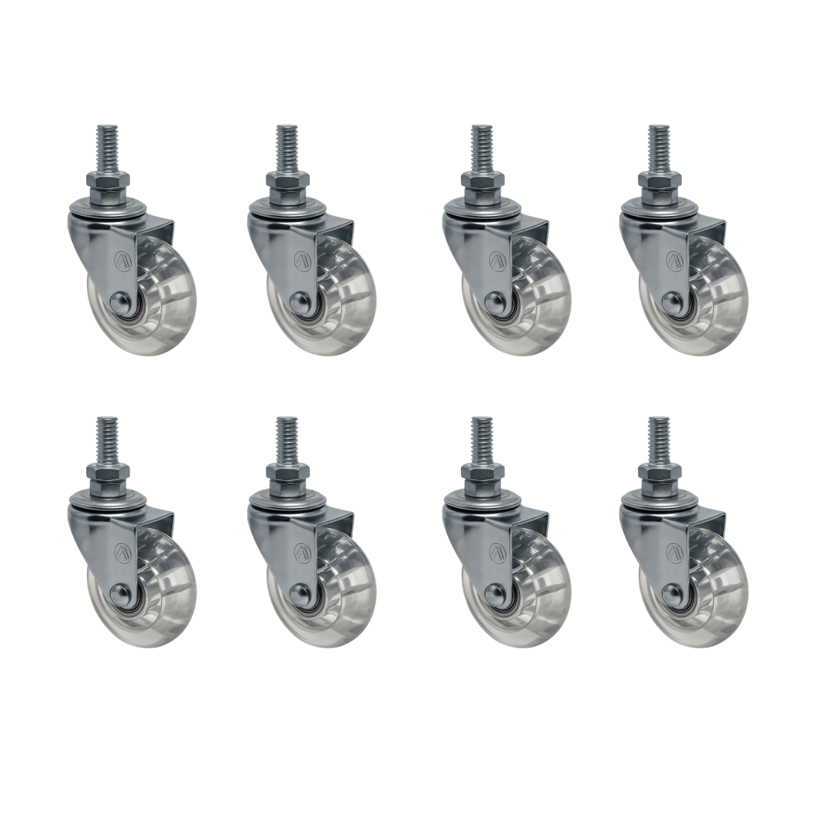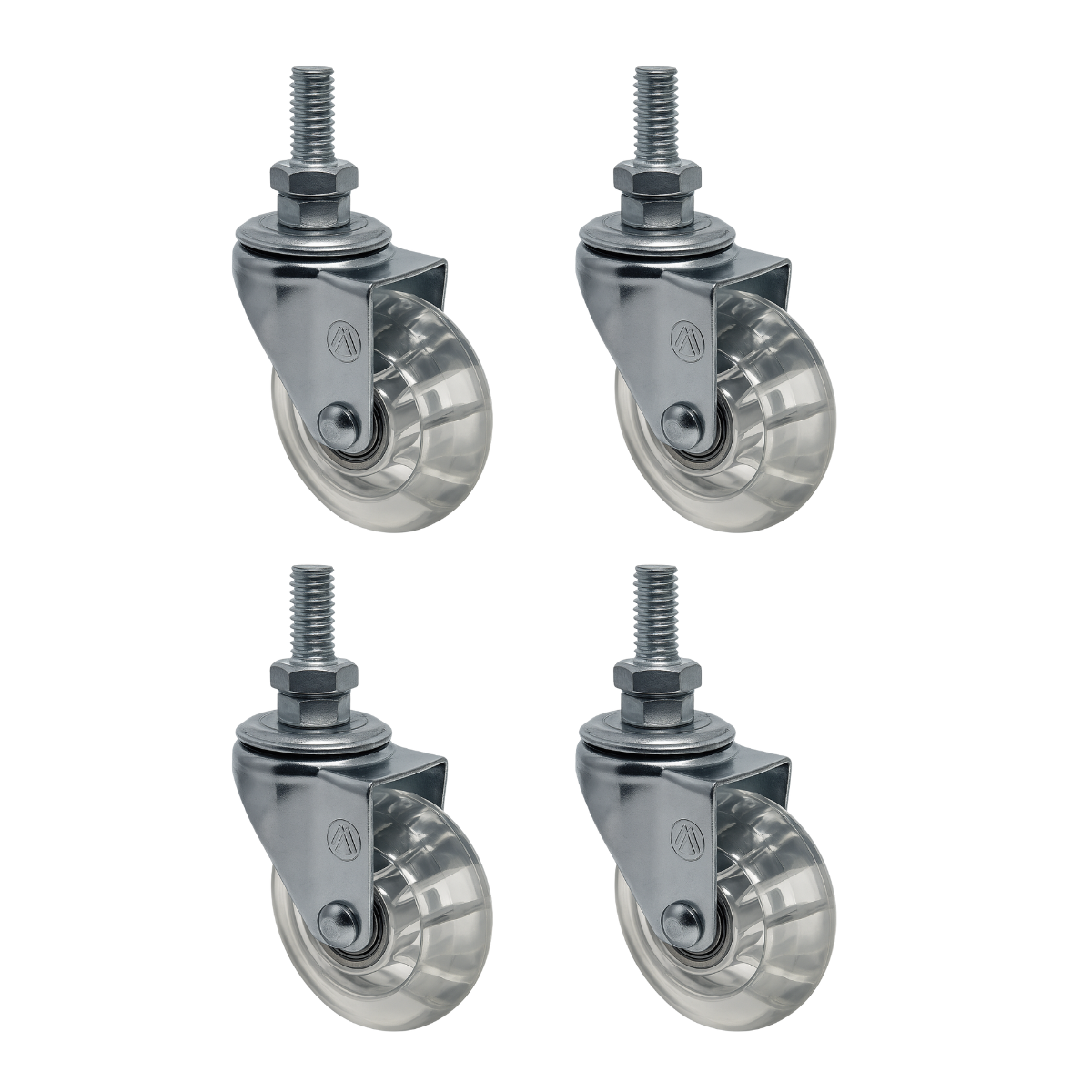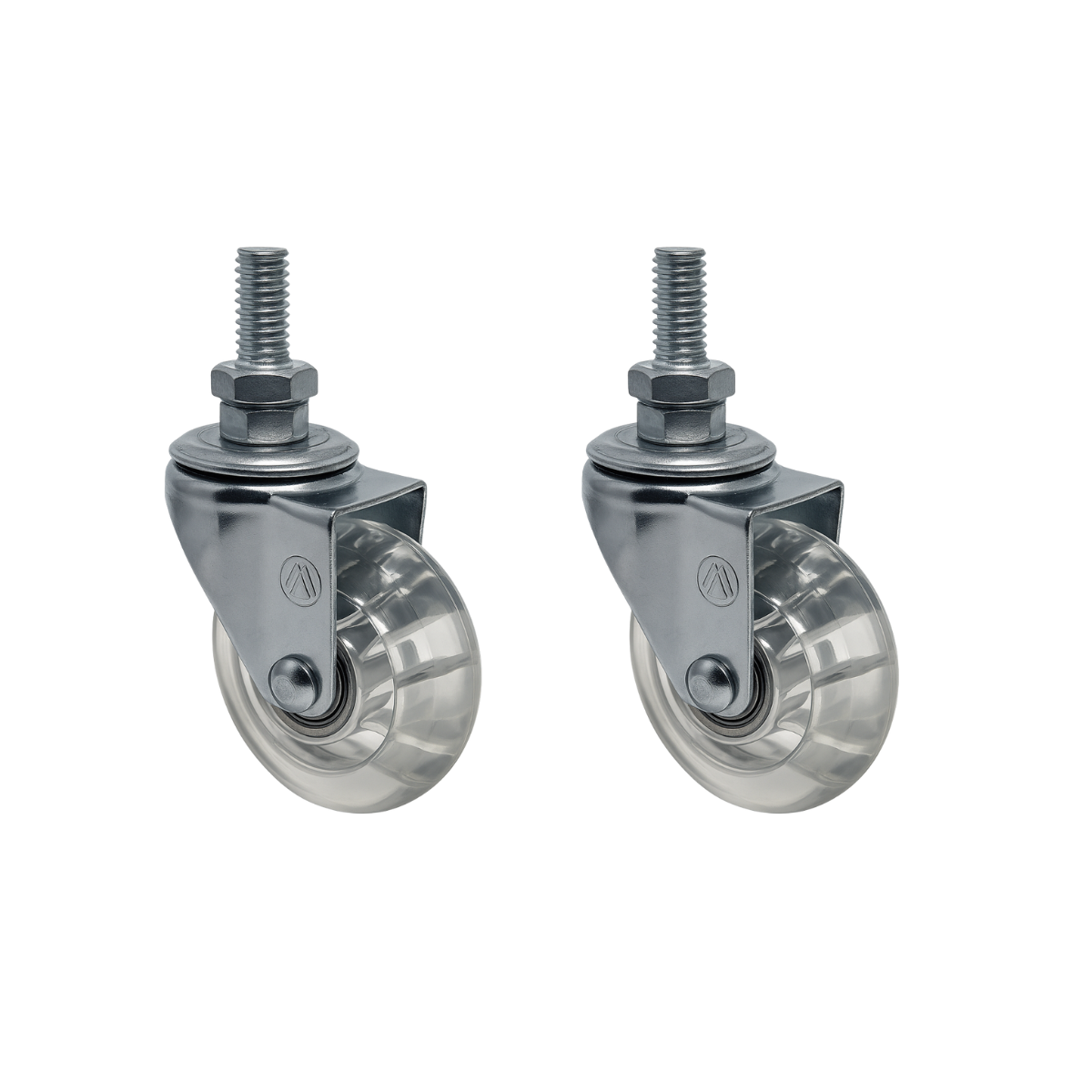 Rodízio montado com garfo em aço cromado, placa zincada e roda em resina termoplástica transparente. Desenvolvido para movimentação silenciosa e proteção de pisos delicados, ideal para móveis, expositores e ambientes comerciais.